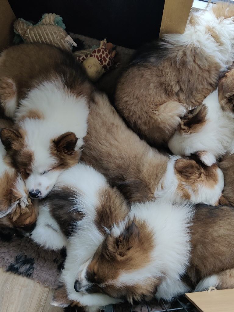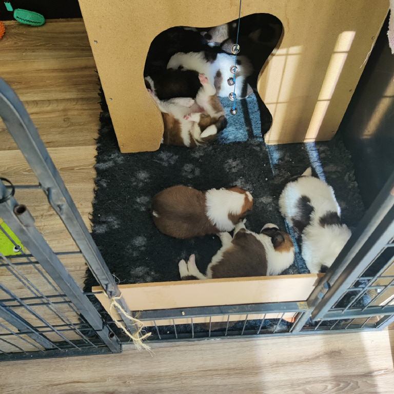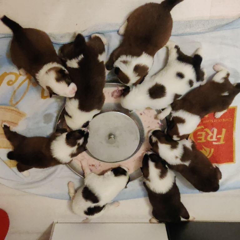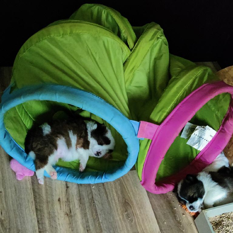 - Die Welpen werden in der Wurfbox im Schlafzimmer geboren. Dort bleiben sie bis zur 3. Woche, bis sie die Augen und Ohren geöffnet haben und beginnen, erste Nahrung zu fressen.