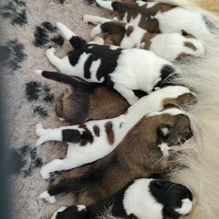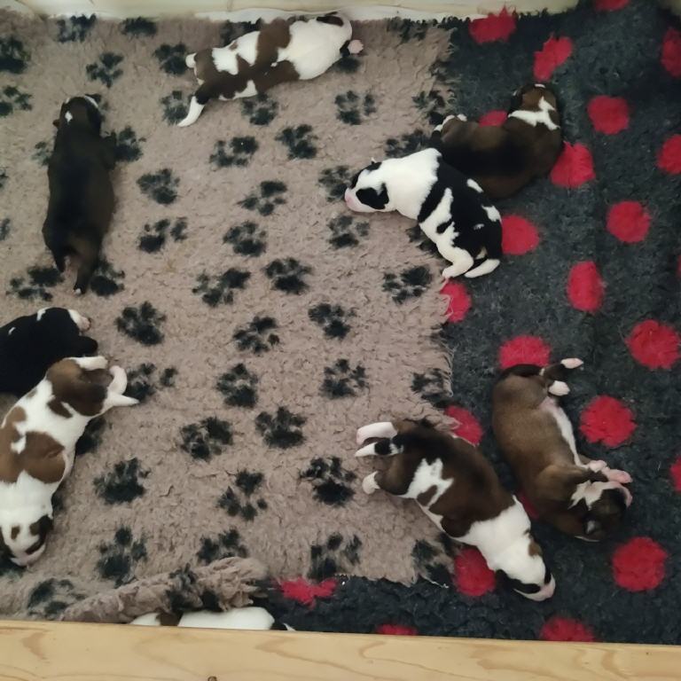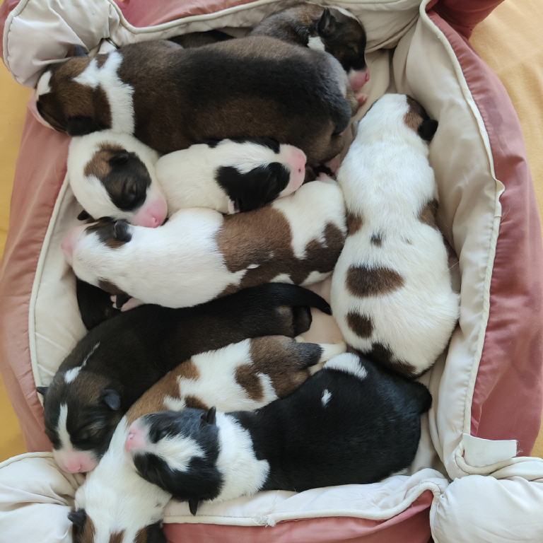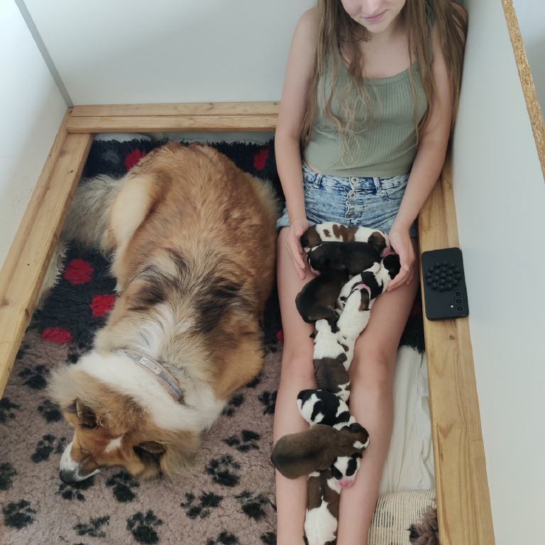 Am 26. Juli 2025 in den Abendstunden hat Cyra in einer komplikationslosen Geburt 9 kräftige, gesunde Welpen geboren. Die ersten Anzeichen, dass es heute soweit sein wird hat uns Cyra schon am Morgen gegeben. Doch dann hiess es geduldig warten. Als sich Cyra um 18 Uhr gemütlich zum Schlafen legte, gingen wir vor den Fernseher. Um kurz nach 19 Uhr hörten wir dann ein Quietschen und der erste Welpe war bereits abgenabelt neben Cyra am Boden. Wir zügelten ihn in die Wurfbox, wo sie dann alle weiteren 8 Welpen pünktlich im 30 Minuten Rhythmus geboren hat. Es sind 6 Rüden und 3 Hündinnen.